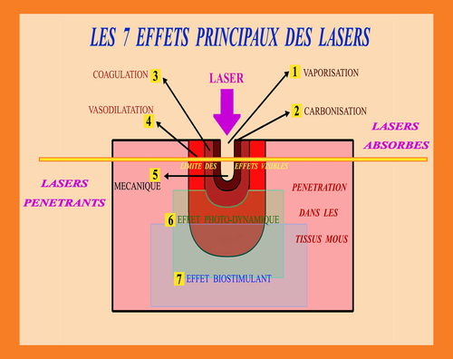 En fonction de son absorption dans les différents tissus, chaque laser a donc des applications privilégiées qui seront plutôt dirigées vers les effets ablatifs pour les lasers absorbés et plutôt vers les effets photodynamiques et biostimulants pour les lasers pénétrants.